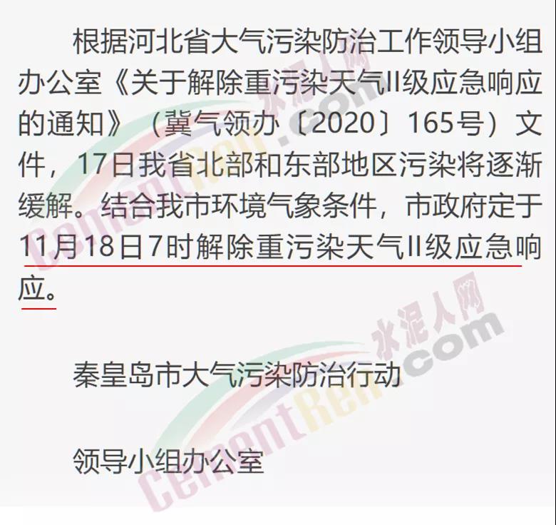 秦皇島市大氣污染防治行動領導小組辦公室通知,根據河北省大氣污染防治工作領導小組辦公室《關于解除重污染天氣II級應急響應的通知》(冀氣領辦〔2020〕165號)文件,17日河北省北部和東部地區污染將逐漸緩解。結合我市環境氣象條件,市政府定于11月18日7時解除重污染天氣II級應急響應。