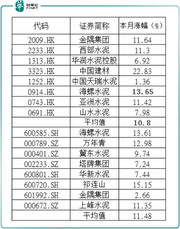 據Wind數據顯示,截至2020年11月02日至11月17日收盤,A股水泥板塊中,股價累計漲幅跑贏所屬板塊的企業有海螺水泥(600585-SH)、萬年青(000789-SZ)、祁連山(600720-SH);H股水泥股板塊中,股價累計漲幅跑贏所屬板塊的企業有金隅集團(02009-HK)、西部水泥(02233-HK)、中國建材(03323-HK)、海螺水泥(00914-HK)、亞洲水泥(00743-HK)。
