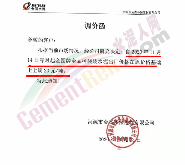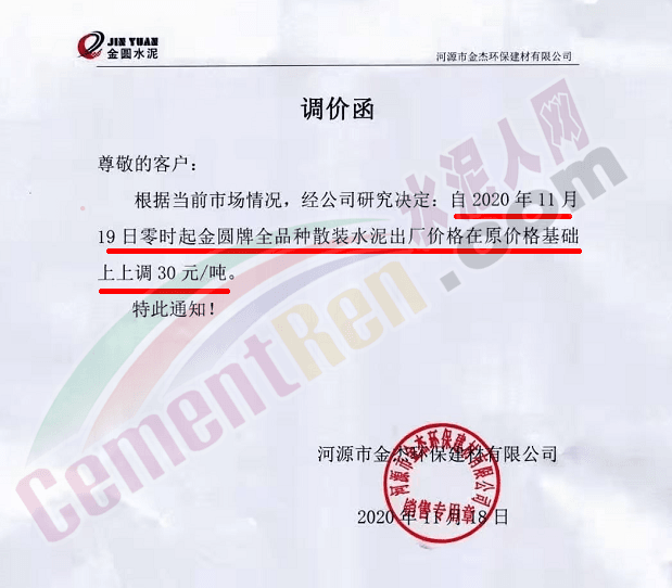 金圓水泥通知,11月19日0時各品種散裝水泥上調30元/噸,本月14日,金圓水泥還曾上調全品種袋裝水泥20元/噸。