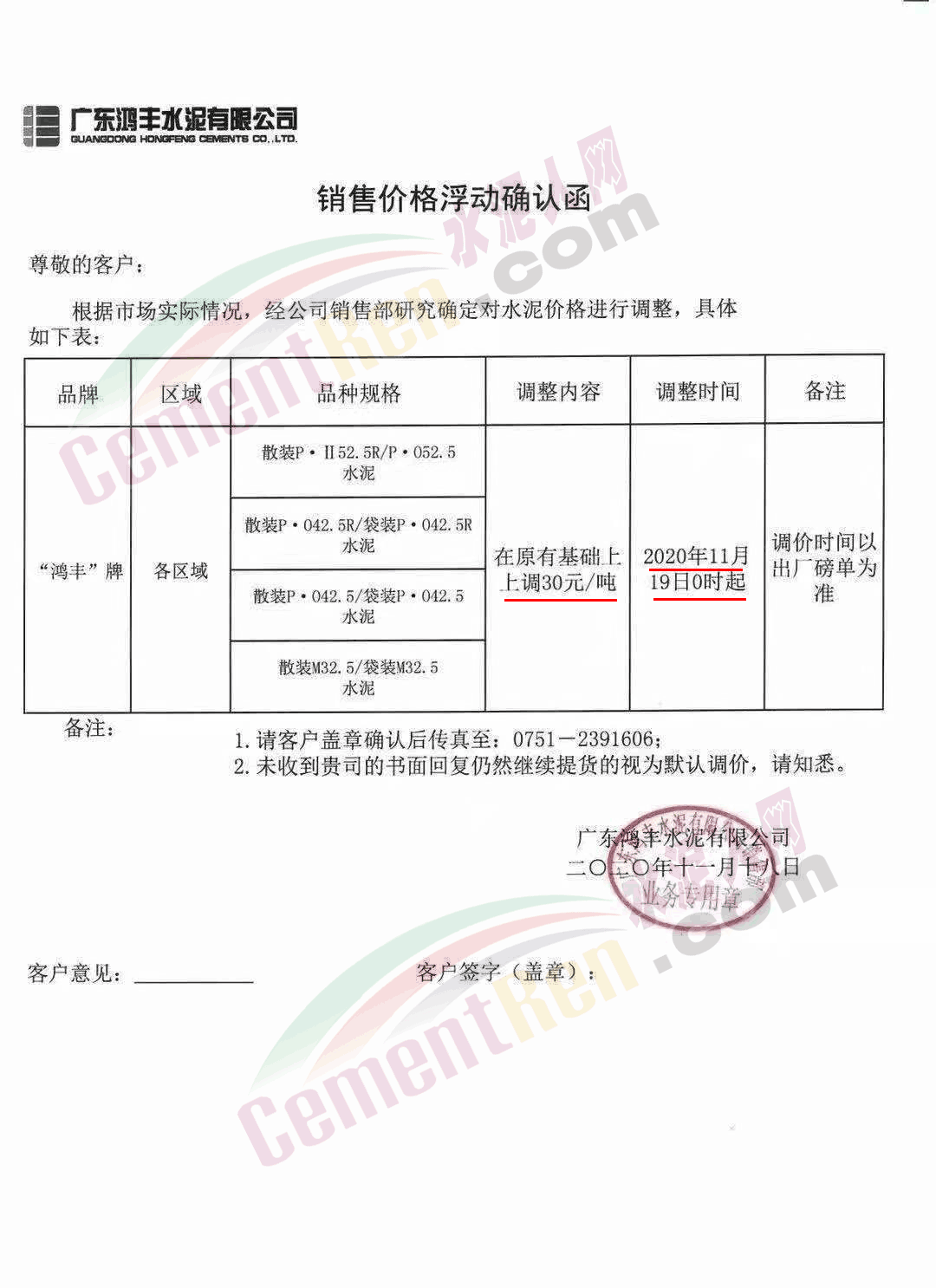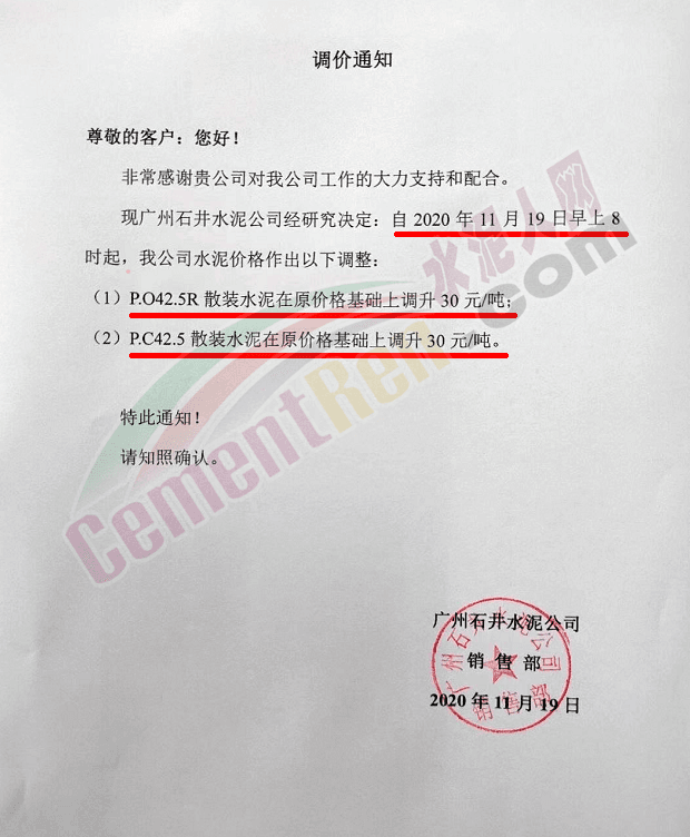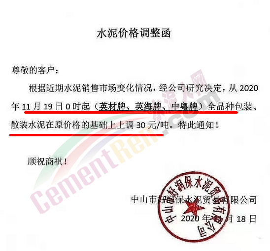 廣東鴻豐水泥通知自今日(19日)0時起,上調各標號散裝水泥報價30元/噸。