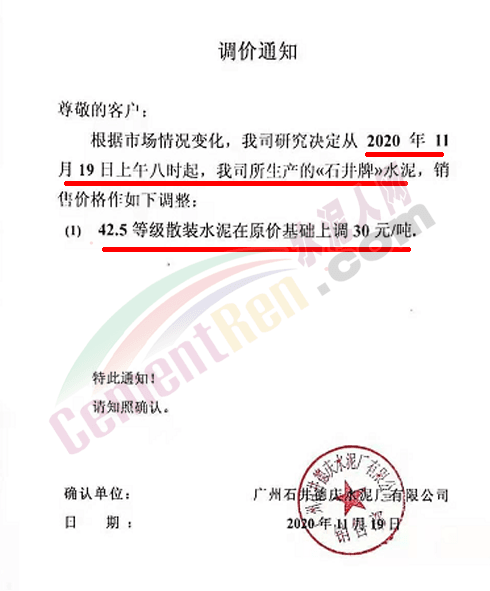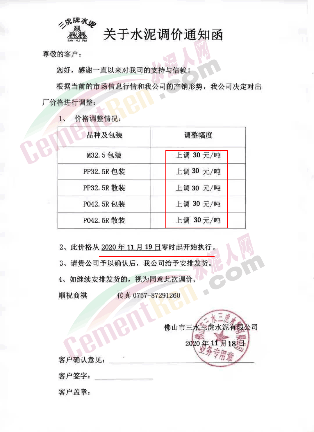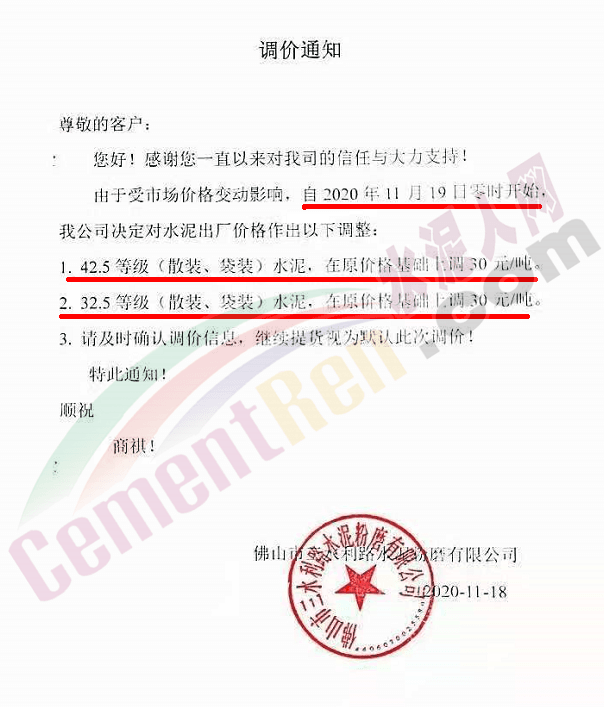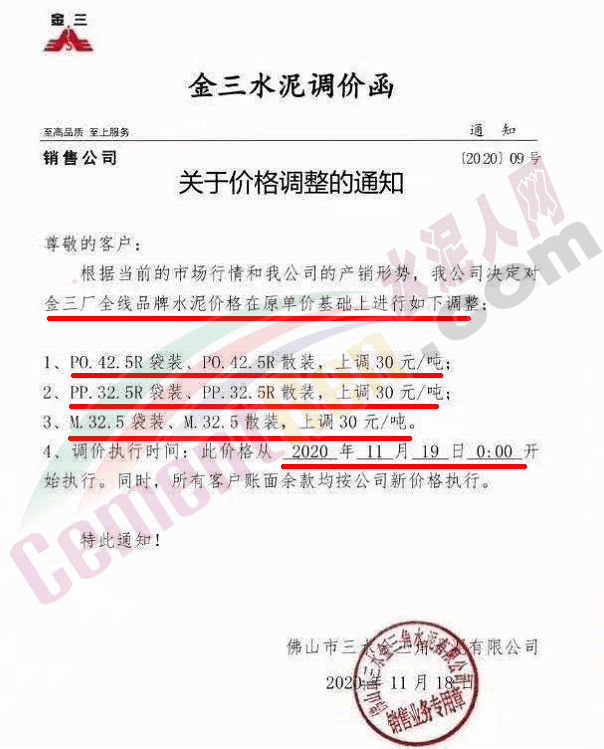 佛山市三水三虎水泥通知自今日(19日)零時起各標號水泥上調30元/噸。