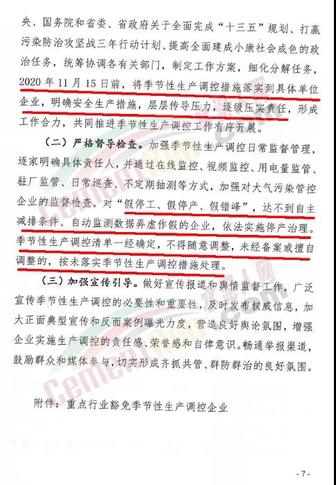 嚴(yán)格督導(dǎo)檢查。加強(qiáng)季節(jié)性生產(chǎn)調(diào)控日常監(jiān)督管理, 逐家明確具體責(zé)任人,并通過在線監(jiān)控、視頻監(jiān)控、用電量監(jiān)管、 駐廠監(jiān)管、日常巡查、不定期抽測等方式,加強(qiáng)對大氣污染管控 企業(yè)的監(jiān)督檢查,對“假停工、假停產(chǎn)、假錯峰”,達(dá)不到自主減排條件、自動監(jiān)測數(shù)據(jù)弄虛作假的企業(yè),依法實(shí)施停產(chǎn)治理。季節(jié)性生產(chǎn)調(diào)控清單一經(jīng)確定,不得隨意調(diào)整,未經(jīng)備案或擅自調(diào)整的,按未落實(shí)季節(jié)性生產(chǎn)調(diào)控措施處理。重點(diǎn)行業(yè)豁免季節(jié)性生產(chǎn)調(diào)控企業(yè)名單列表中20家企業(yè)不包括水泥行業(yè)。 通知全文如下: