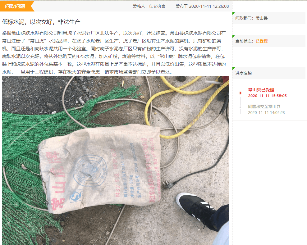 其實(shí),被仿冒的又何止海螺水泥一家。日前,有網(wǎng)友在通衢網(wǎng)絡(luò)問政平臺(tái)留言舉報(bào)常山虎躍水泥有限公司利用虎子水泥老廠區(qū)非法生產(chǎn),以次充好,違法經(jīng)營(yíng)。