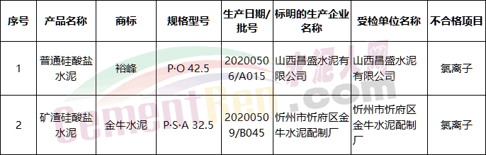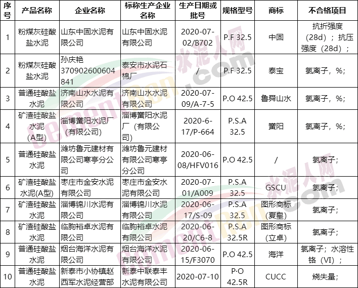11月6日山東省市場(chǎng)監(jiān)督管理局網(wǎng)站公布2020年水泥產(chǎn)品質(zhì)量省級(jí)監(jiān)督抽查結(jié)果, 發(fā)現(xiàn)10家企業(yè)的10批次產(chǎn)品不符合相關(guān)標(biāo)準(zhǔn)的要求,不合格項(xiàng)目為氯離子、燒失量、28d強(qiáng)度、水泥溶性鉻(VI)項(xiàng)目。