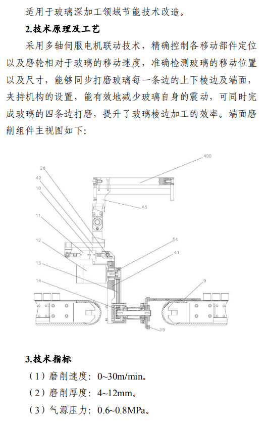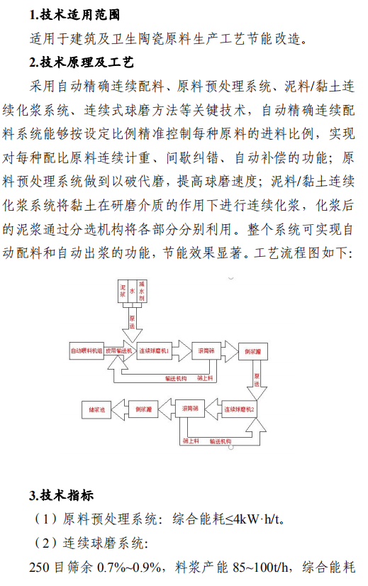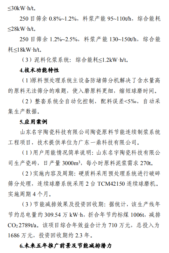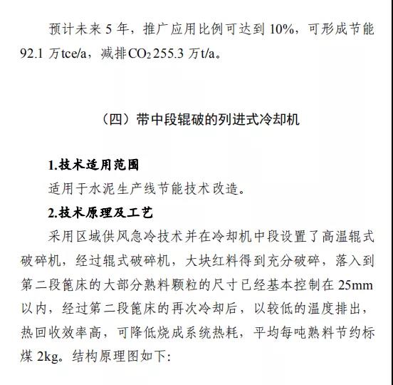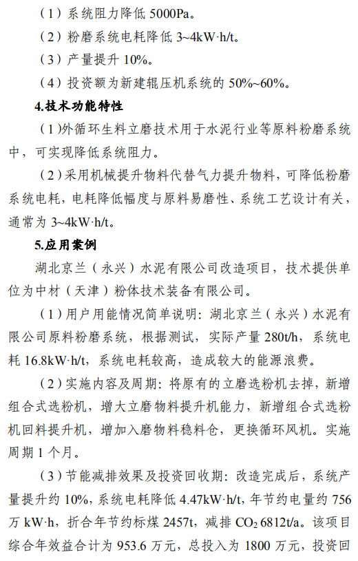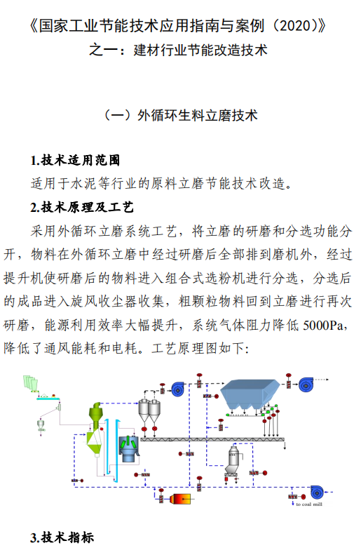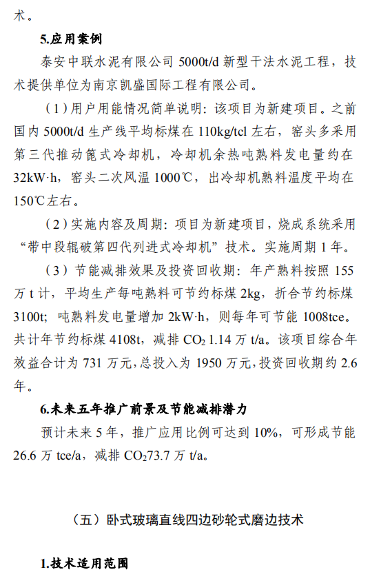 之一:建材行業(yè)節(jié)能改造技術外循環(huán)生料立磨節(jié)能技術,采用外循環(huán)立磨系統工藝,將立磨的研磨和分選功能分開,系統氣體阻力降低5000Pa,通風能耗和電耗降低,粉磨系統電耗降低3-4kW·h/t,能源利用效率大幅提升。在湖北京蘭(永興)水泥有限公司改造項目中,系統產量提升約10%,系統電耗降低4.47kW·h/t,年節(jié)約電量約756萬kW·h,折合年節(jié)約標煤2457t,減排二氧化碳6812t/a。鋼渣/礦渣輥壓機終粉磨系統節(jié)能技術,以輥壓機和動靜組合式選粉機為核心設備,輥面壽命可達立磨的2倍,具有廣泛的物料適應性;全部物料為外循環(huán),除鐵方便,避免塊狀金屬富集;系統阻力低,節(jié)電效果明顯,礦渣微粉生產的系統電耗<35kW·h/t。在邯鄲市邦信建材有限公司礦渣粉磨及儲存(30萬t/a)項目中,鋼渣/礦渣輥壓機終粉磨系統年節(jié)約電量約120萬kW·h,折合年節(jié)約標煤390t,減排二氧化碳1081t/a。陶瓷原料連續(xù)制漿系統節(jié)能技術,采用自動精確連續(xù)配料、原料預處理系統、泥料/黏土連續(xù)化漿系統、連續(xù)式球磨方法等關鍵技術,實現自動配料和自動出漿的功能,原料預處理系統綜合能耗≤4kW·h/t,250目篩余0.7%-0.9%、料漿產能85-100t/h連續(xù)球磨系統綜合能耗≤30kW·h/t,泥料化漿系統綜合能耗≤1.2kW·h/t,節(jié)能效果顯著。山東名宇陶瓷科技有限公司陶瓷原料節(jié)能連續(xù)制漿系統改造項目,生產線年節(jié)約總電量約309.54萬kW·h,折合年節(jié)約標煤1006t,減排二氧化碳2789t/a。帶中段輥破的列進式冷卻機節(jié)能技術,采用區(qū)域供風急冷技術并在冷卻機中段設置了高溫輥式破碎機,使大塊紅料得到充分破碎,落入到第二段篦床冷卻后,以較低的溫度排出,熱回收效率高,可降低燒成系統熱耗,平均每噸熟料節(jié)約標煤2kg。在泰安中聯水泥有限公司5000t/d新型干法水泥工程項目中,系統運行穩(wěn)定,年節(jié)約標煤4108t,減排二氧化碳1.14萬t/a。臥式玻璃直線四邊砂輪式磨邊技術,采用多軸伺服電機聯動技術,精確控制各移動部件定位以及磨輪相對于玻璃的移動速度,磨邊速度15-30m/min,玻璃所需磨邊時間平均20s/m2,可同時完成玻璃的四條邊打磨,提升了玻璃棱邊加工的效率。在廣宇洛玻(北京)工業(yè)玻璃有限公司改造項目中,該項目年節(jié)約標煤46.8t,減排二氧化碳1170t/a。新型水泥熟料冷卻技術及裝備,采用新型前吹高效篦板、高效急冷斜坡、高溫區(qū)細分供風、新型高溫耐磨材料、智能化“自動駕駛”、新型流量調節(jié)閥等技術,熱回收效率高、輸送運轉率高、磨損低。在淶水冀東水泥有限公司篦冷機改造項目中,噸熟料工序電耗下降2.57kW·h,每年可節(jié)電370萬kW·h,折合標煤1202.5t,工序標煤耗下降2.81kg/tcl,每年可節(jié)約5100tce,余熱發(fā)電年增加發(fā)電量570萬kW·h,折合標煤1852.5t。綜合年節(jié)約標煤8155t,減排二氧化碳2.26萬t/a。