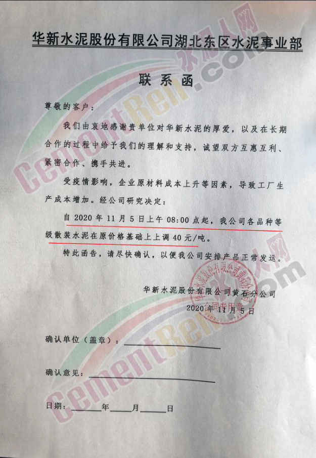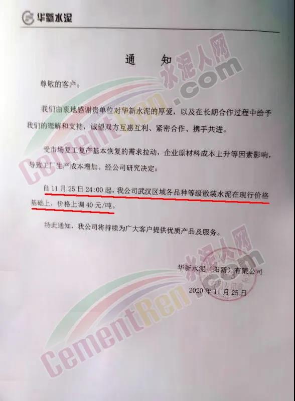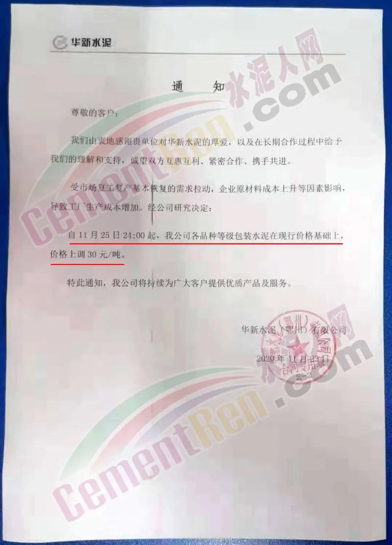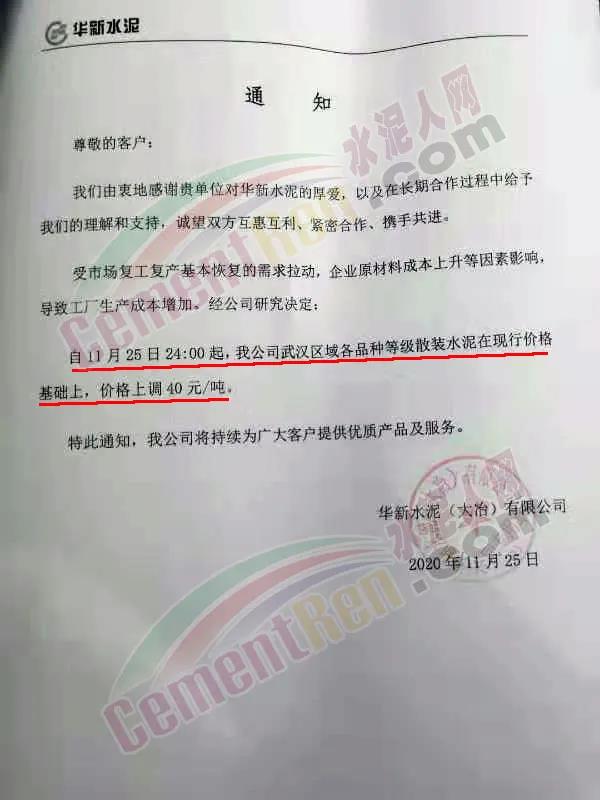 華新水泥(大冶)有限公司、華新水泥(陽新)有限公司、華新水泥(鄂州)有限公司通知受市場復工復產基本恢復的需求拉動,企業原材料成本上升等因素影響,導致工廠生產成本增加,經公司研究決定:自11月25日24時起,公司各品種等級散裝水泥在現行價格基礎上,上調30~40元/噸。