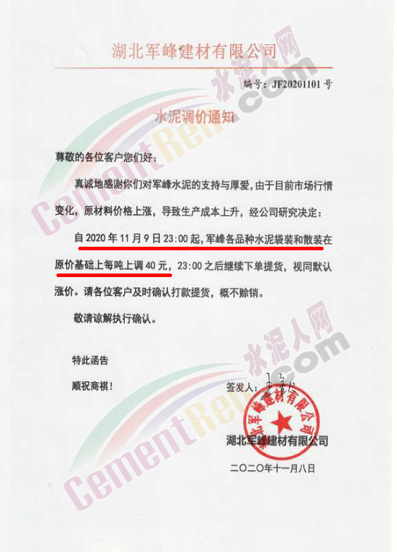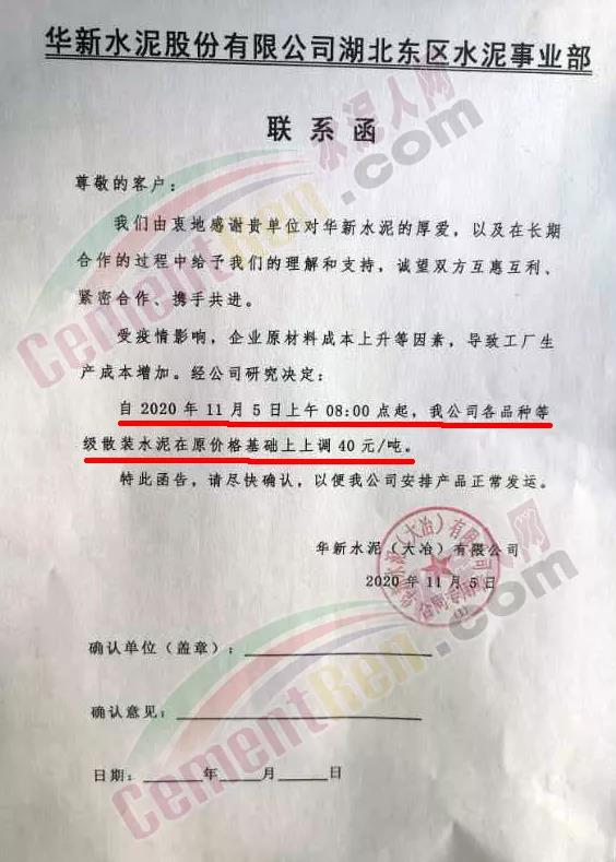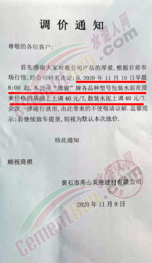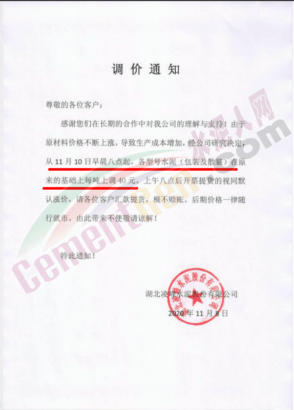 而區域主要品牌企業是在月初時通知上調水泥價格的。華新水泥湖北東區水泥事業部鄂州公司、黃石分公司、大冶公司通知,自11月5日起各品種等級散裝水泥在原價基礎上上調40元/噸。