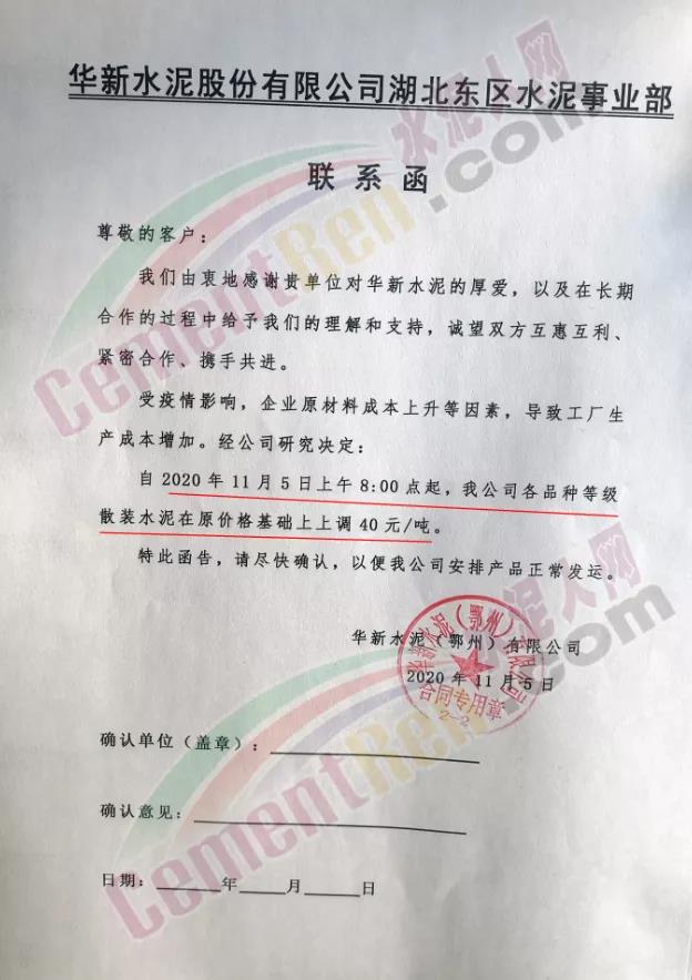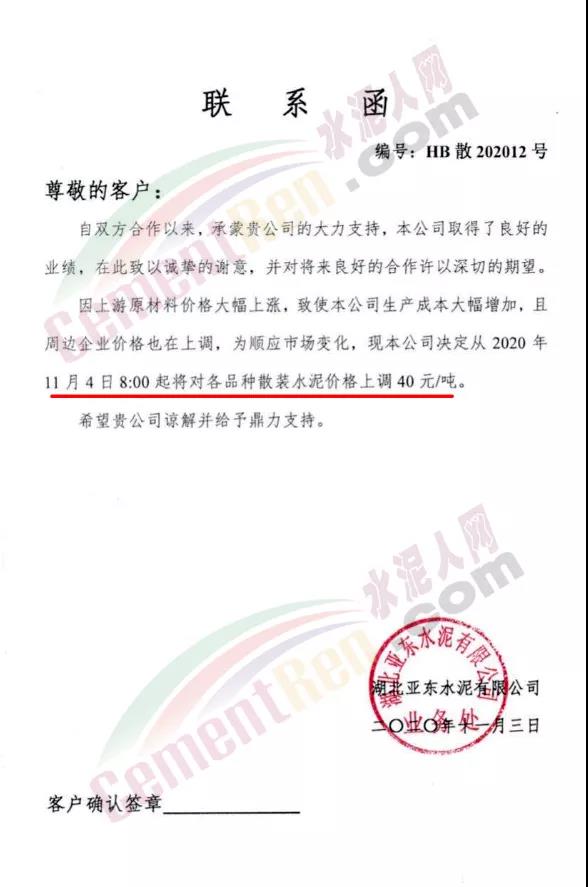 湖北亞東水泥有限公司聯系函稱,因上游原材料價格大幅上漲,致使公司生產成本大幅增加,且周邊企業價格也在上調,為順應市場變化 ,公司決定從11月25日8時起對各品種水泥價格上調30元/噸。