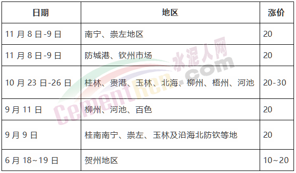 廣西區域下半年以來,分別在6中下旬,9月中旬,10月下旬及11月中旬前后四次上調水泥價格,累計上調達90元/噸。極個別企業累計上調100元/噸以上。