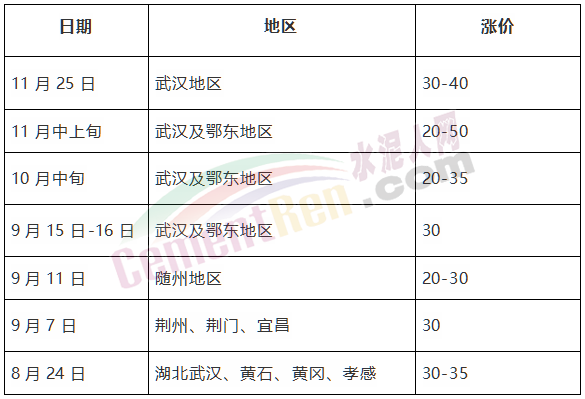 湖北地區武漢及鄂東地區分別在11月中上旬,11月下旬,10月中旬及9月中上旬、8月下旬分5次上調水泥價格,累計上調180元/噸。單位:元/噸