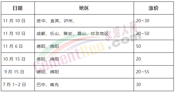 四川區域以德綿區域為主,自下半年以來已經連續三次上調水泥價格累計上調90~125元/噸。