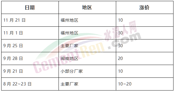 下半年以來福建地區分別在八月、九月及十一月中下旬上調水泥價格,三輪累計上漲60元/噸。