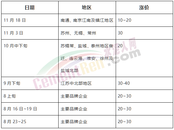 江蘇地區水泥價格基本完成下半年五輪普漲,累計上調達120~140元/噸,個別企業累計上調七輪,累計上調達210元/噸。