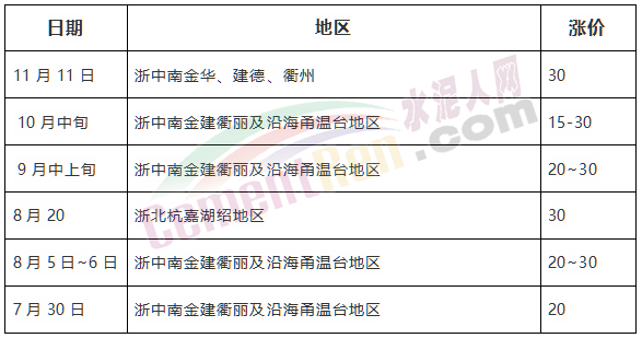 浙江省以上海周邊地區為主,下半年以來分別在7月下旬,8月上旬、下旬,9月中上旬以及10月中旬和11月中旬分六次上調水泥價格,累計上調135~170元/噸。