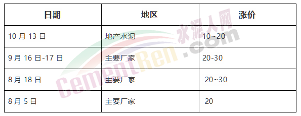 重慶地區下半年從9月下旬開始上調水泥價格,三輪上調,累計上調90~110元/噸。