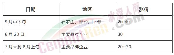下半年以來,河南地區主要品牌企業已經連續八輪連漲累計上調最高達170~260元/噸,僅8月中旬到9月初水泥價格連續推漲四輪,幅度高達100~120元/噸。