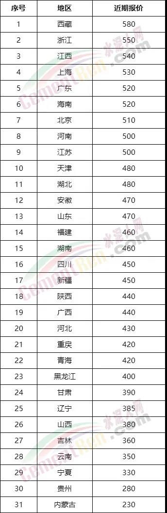 截止目前,最高價仍在西藏,浙江區域出廠均價達到550元/噸。最低價仍在內蒙古地區,最低均價達到230元/噸以下。