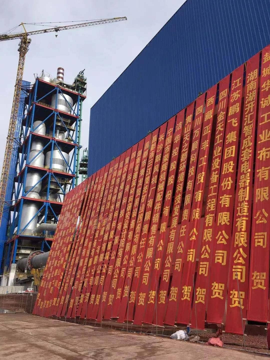 在新項目點火儀式現場,掛滿了成都利君實業、鹽城華誠、湖南湖開匯智成套電器、江蘇鵬飛、四川金天工業設備、西藏正豐工貿等公司的祝賀條幅,現場工人們在做點火前的準備工作。