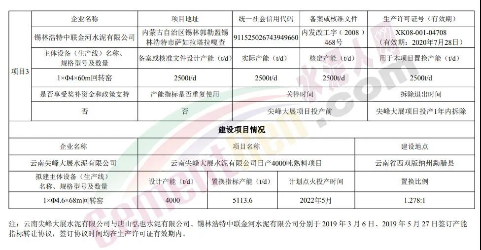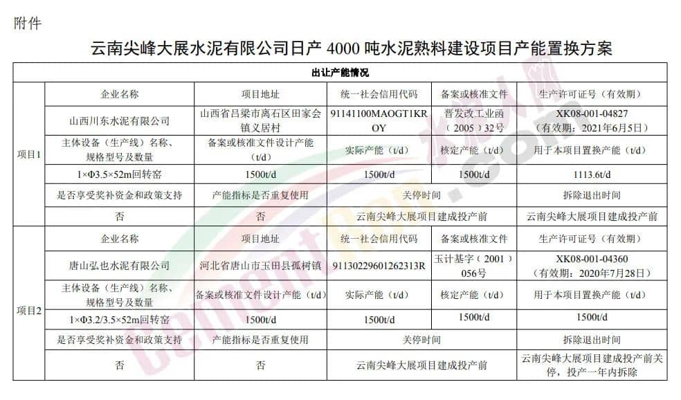 日前,云南工信廳發(fā)布《云南尖峰大展水泥有限公司日產(chǎn)4000噸熟料建設(shè)項目產(chǎn)能置換方案公示》稱,按照相關(guān)文件要求,現(xiàn)將“云南尖峰大展水泥有限公司日產(chǎn)4000噸熟料建設(shè)項目產(chǎn)能置換方案”予以公示。公示期為2020年11月25日至12月8日。如有異議,請于公示期內(nèi)向云南省工業(yè)和信息化廳反映,歡迎社會公眾進(jìn)行監(jiān)督。公示文件全文如下: