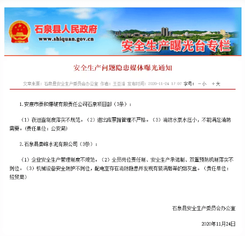 日前,陜西安康石泉縣安全生產委員會辦公室發布了《安全生產問題隱患媒體曝光通知》 石泉縣秦峰水泥有限公司涉及三條安全生產問題被點名。