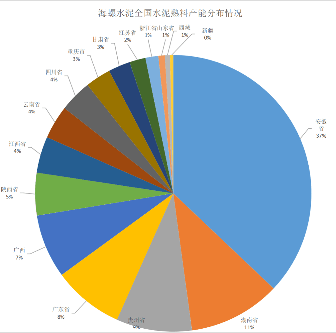 從各地區(qū)水泥熟料產(chǎn)能的占比情況來(lái)看,截至目前,安徽依然是海螺水泥的大本營(yíng),熟料產(chǎn)能占海螺水泥熟料總產(chǎn)能的37%;湖南海螺水泥熟料產(chǎn)能占海螺水泥熟料總產(chǎn)能的11%;其次是貴州省,占海螺水泥熟料總產(chǎn)能的9%。這三個(gè)地區(qū)海螺水泥熟料總和占到海螺水泥熟料總產(chǎn)能的57%,截至目前,海螺水泥在各地區(qū)的熟料產(chǎn)能占比情況如圖2所示。