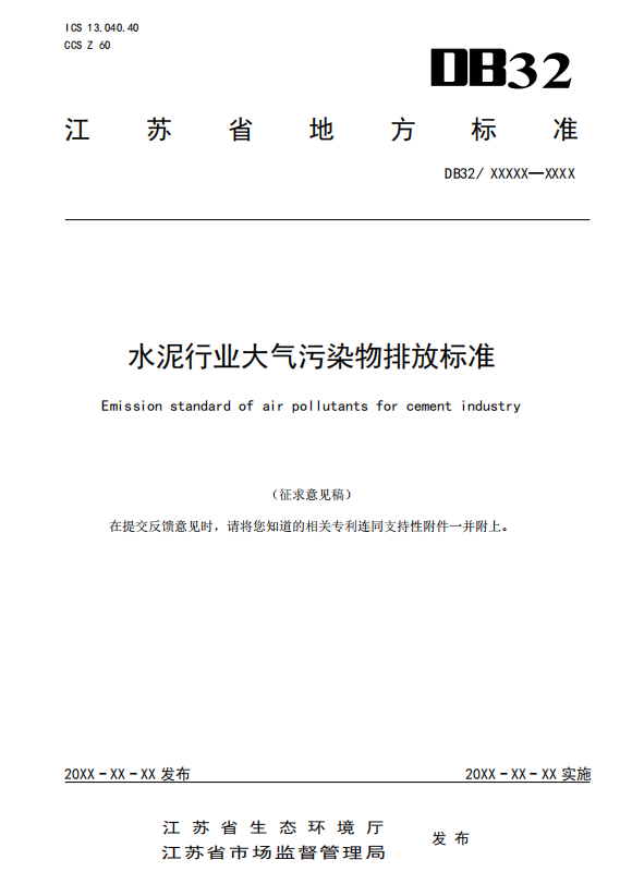 日前,江蘇省生態(tài)環(huán)境廳發(fā)布關于征求地方標準《水泥行業(yè)大氣污染物排放標準(征求意見稿)》意見的函稱,為貫徹《中華人民共和國環(huán)境保護法》、《中華人民共和國大氣污染防治法》、《江蘇省大氣污染防治條例》,加強大氣污染物排放控制,江蘇省生態(tài)環(huán)境廳組織起草了地方標準《水泥行業(yè)大氣污染物排放標準(征求意見稿)》。
