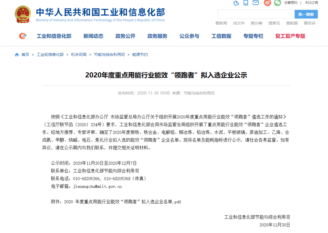 日前,工信部發布《2020年度重點用能行業能效“領跑者”擬入選企業公示》稱,按照《工業和信息化部辦公廳 市場監管總局辦公廳關于組織開展2020年度重點用能行業能效“領跑者”遴選工作的通知》(工信廳聯節函〔2020〕234號)要求,工業和信息化部會同市場監管總局組織開展了重點用能行業能效“領跑者”企業遴選工作。經地方推薦、專家評審,確定了2020年度鋼鐵、鐵合金、電解鋁、銅冶煉、鉛冶煉、水泥、平板玻璃、原油加工、乙烯、合成氨、甲醇、燒堿、電石、焦化行業擬入選的能效“領跑者”企業名單?,F將名單及能耗指標進行公示,請社會各界監督。如有異議,請在公示期內與我們聯系,并提交相關證明材料。