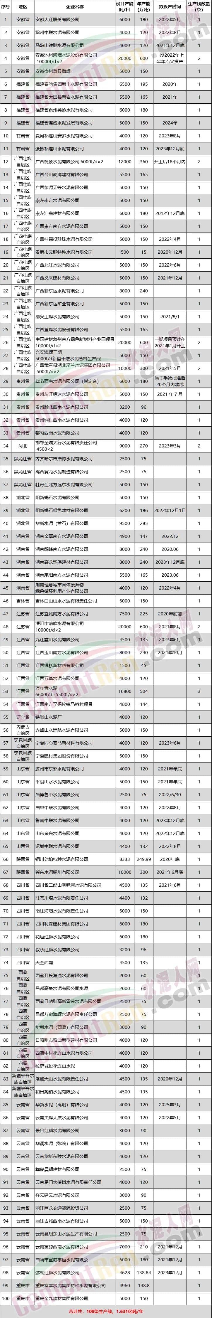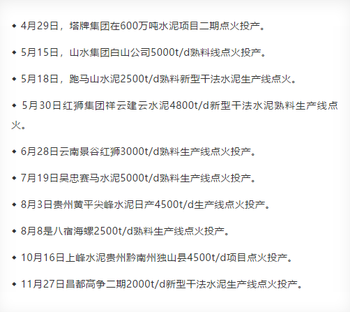 據(jù)水泥人網(wǎng)不完全統(tǒng)計,2020年以來,已投產(chǎn)10條水泥熟料生產(chǎn)線分布在廣東、四川、吉林、云南、貴州、寧夏、西藏等區(qū)域,其產(chǎn)能達到1614萬噸,部分項目如下: