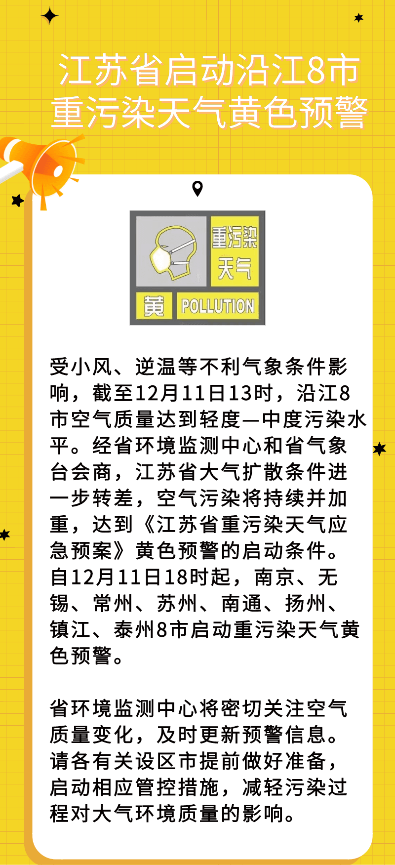 受小風、逆溫等不利氣象條件影響,截至12月11日13時,沿江8市空氣質量達到輕度-中度污染水平。經省環境監測中心和省氣象臺會商,江蘇省大氣擴散條件進一步轉差,空氣污染將持續并加重,達到《江蘇省重污染天氣應急預案》黃色預警的啟動條件。自12月11日18時起,南京、無錫、常州、蘇州、南通、揚州、鎮江、泰州8市啟動重污染天氣黃色預警。