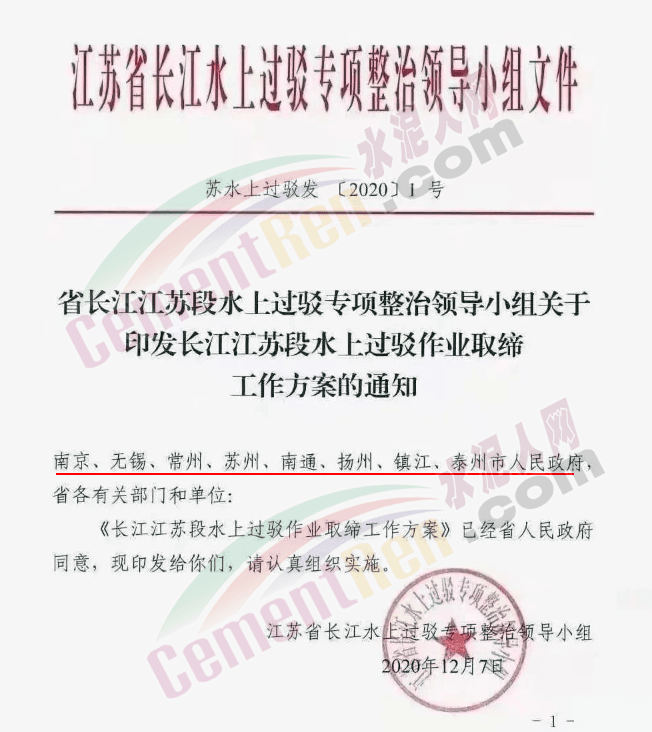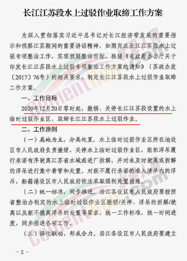 同期,江蘇省長江水上過駁專項整治領導小組印發《長江江蘇段水上過駁作業取締工作方案》,明確2020年12月20日零時起,撤銷、關停長江江蘇段設置的水上臨時過駁作業區,取締長江江蘇段水上過駁作業。