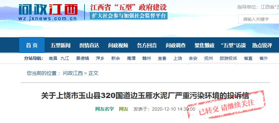 日前,一網友在問政江西上提出玉雁水泥廠污染環境,水泥廠內現又增加了一個泡沫磚廠,污染更加嚴重,并且該水泥廠出現了違法法排污的情況。原文如下: