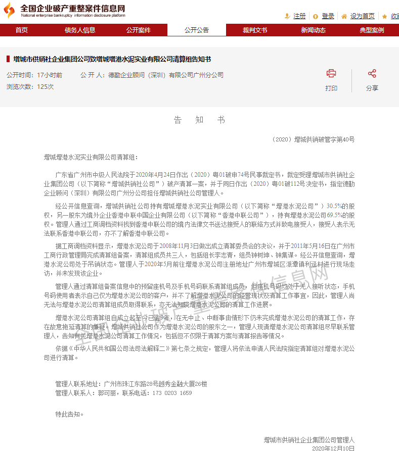 二、增城市供銷社企業集團公司致增城增港水泥實業有限公司清算組告知書