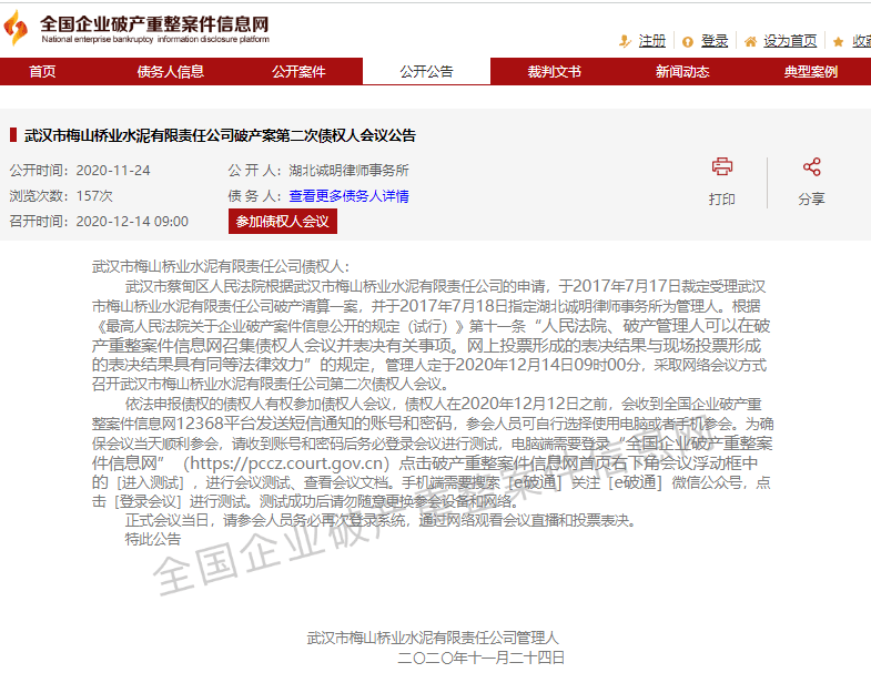 三、武漢市梅山橋業水泥有限責任公司破產案第二次債權人會議