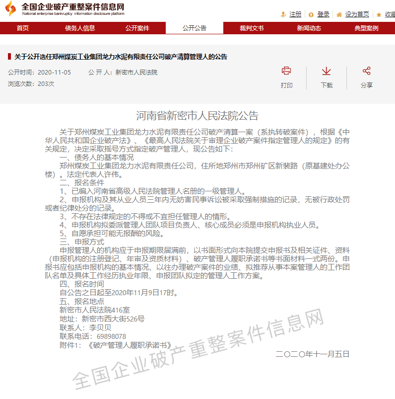四、關于公開選任鄭州煤炭工業集團龍力水泥有限責任公司破產清算管理人