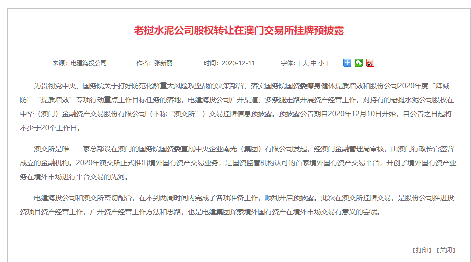 日前,中國電建官網發布消息稱,為防范化解重大風險攻堅戰的決策部署、落實瘦身健體提質增效和股份公司2020年度“降減防”“提質增效”專項行動重點工作目標任務的落地,電建海投公司廣開渠道、多條腿走路開展資產經營工作,對持有的老撾水泥公司股權在中華(澳門)金融資產交易股份有限公司(下稱“澳交所”)交易掛牌信息預披露。預披露公告期自2020年12月10日開始,自公告之日起將不少于20個工作日。澳交所是唯一一家總部設在澳門的國務院國資委直屬中央企業南光(集團)有限公司發起,經澳門金融管理局審核,由澳門行政長官簽署成立的金融機構。2020年澳交所正式推出境外國有資產交易業務,是國資監管機構認可的首家境外國有資產交易平臺,開創了境外國有資產業務在境外市場進行平臺交易的先河。