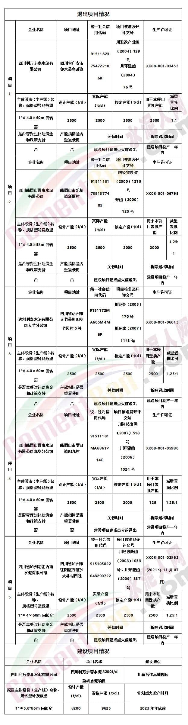 公示文件稱,將退出五條生產(chǎn)線共計9625t/d熟料生產(chǎn)線按照1:1.25置換比例進行產(chǎn)能置換,用于新建一條日產(chǎn)8200噸的新型干法水泥熟料生產(chǎn)線(窯徑Ф5.6m)。 建設(shè)地點位于川渝合作高灘園區(qū),新建線計劃點火投產(chǎn)時間為2023年年底前,減量置換為例為1:1.25。