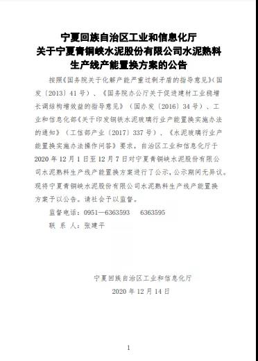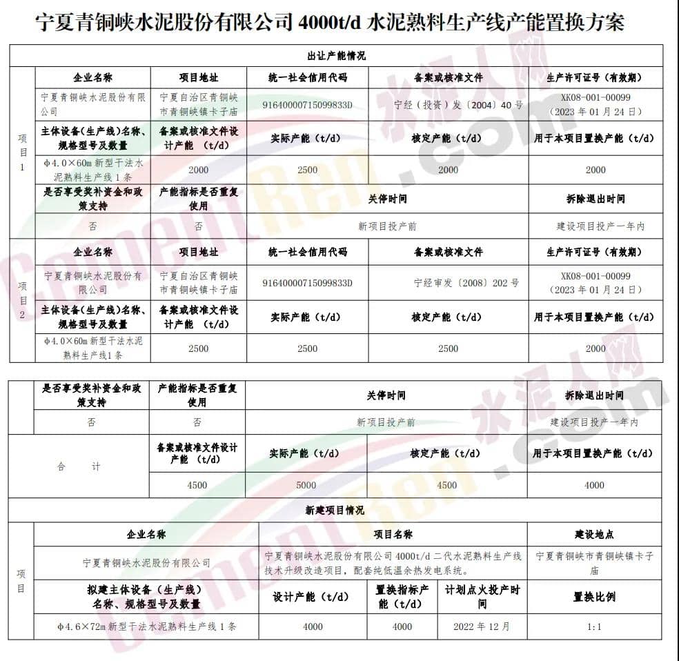 寧夏青銅峽水泥股份有限公司水泥熟料生產(chǎn)線產(chǎn)能置換方案