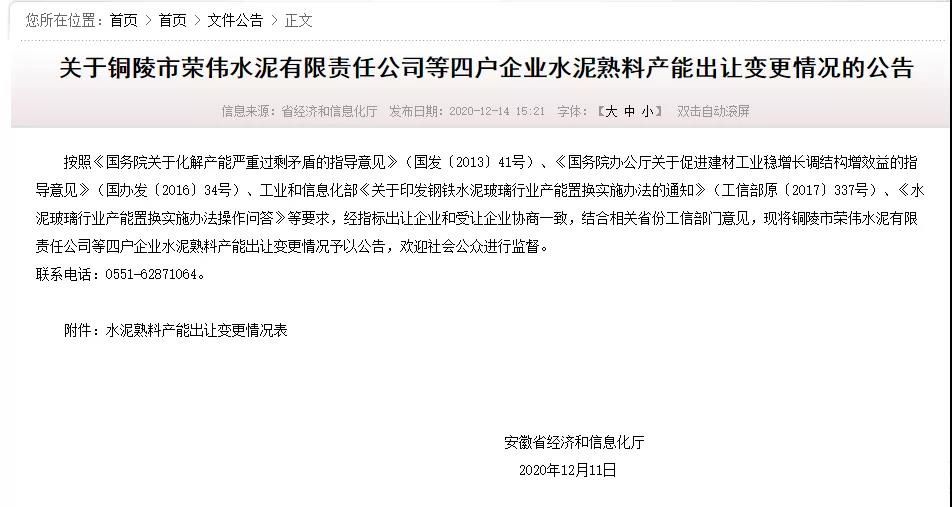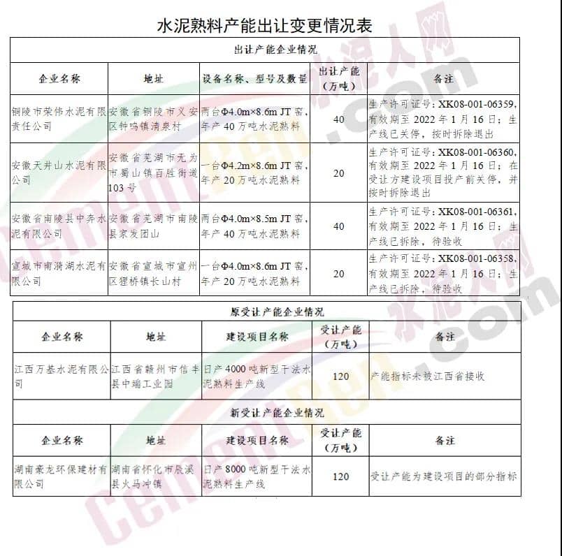 銅陵市榮偉水泥有限責(zé)任公司等四戶企業(yè)水泥熟料產(chǎn)能出讓變更情況公告