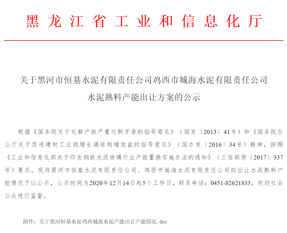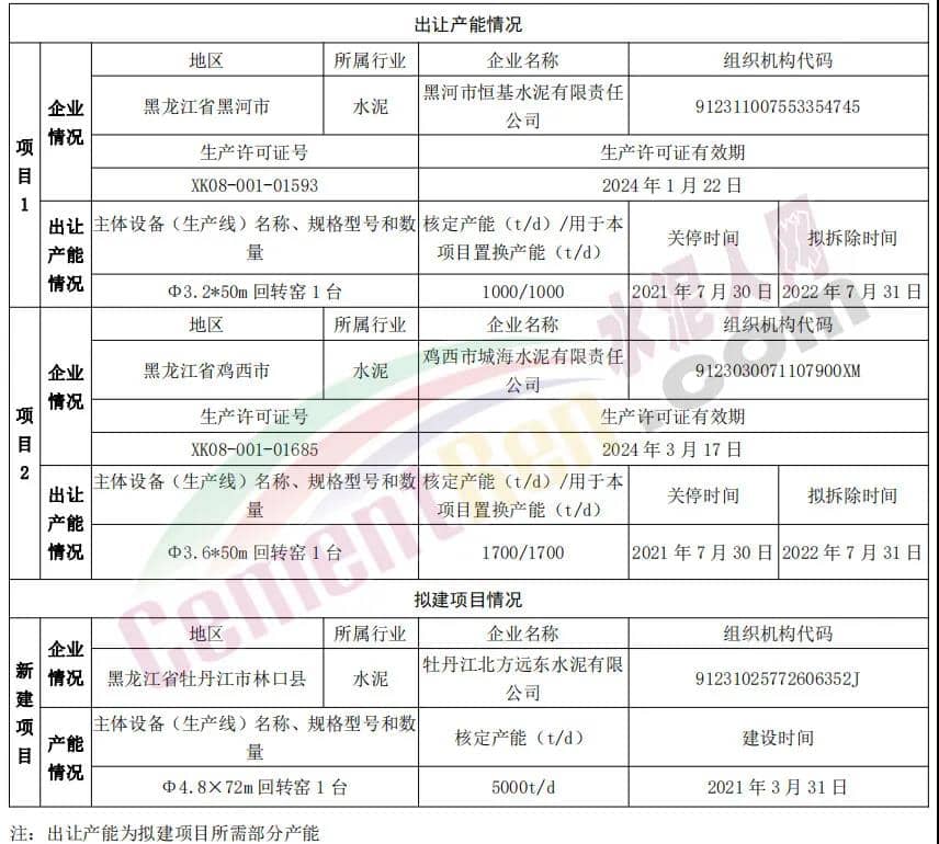 黑龍江省 黑河市恒基水泥有限責(zé)任公司雞西市城海水泥有限責(zé)任公司水泥熟料產(chǎn)能出讓公示黑龍江省工信廳發(fā)布《關(guān)于黑河市恒基水泥有限責(zé)任公司雞西市城海水泥有限責(zé)任公司水泥熟料產(chǎn)能出讓公示》,公示文件顯示,黑河市恒基水泥有限責(zé)任公司擬出讓水泥熟料產(chǎn)能1000t/d水泥熟料產(chǎn)能、雞西市城海水泥有限責(zé)任公司擬出讓水泥熟料產(chǎn)能1700t/d,用于牡丹江北方遠東水泥有限公司將新建一條5000t/d水泥熟料生產(chǎn)線。退出產(chǎn)能擬除拆時間為2022年7月底,新建項目建設(shè)時間為2021年3月31日。