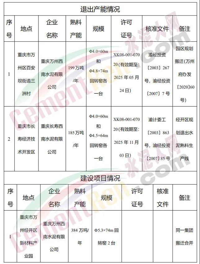 重慶市經(jīng)信委發(fā)布《關(guān)于重慶萬州西南水泥有限公司和重慶長壽西南水泥有限公司搬遷項目情況的公示》顯示,重慶萬州西南水泥有限公司兩臺回轉(zhuǎn)窯(共計199萬噸熟料產(chǎn)能)、重慶長壽西南水泥有限公司兩臺回轉(zhuǎn)窯(共計185萬噸熟料產(chǎn)能)將合并搬遷至萬州經(jīng)開區(qū),建設(shè)Φ5.3×74m回轉(zhuǎn)窯2臺,產(chǎn)能合計為384萬噸/年。按照工信部此前公示的《水泥熟料產(chǎn)能換算表》外徑Φ5.3的回轉(zhuǎn)窯熟料產(chǎn)能約為6500t/d左右。公示原文如下: