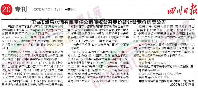 日前,四川日報(bào)發(fā)布了一則題為《江油市盛馬水泥有限責(zé)任公司債權(quán)公開競價轉(zhuǎn)讓暨競價結(jié)果》的公告稱,中國長城資產(chǎn)管理股份有限公司四川省分公司對擁有的江油市盛馬水泥有限責(zé)任公司債權(quán)資產(chǎn)已在阿里巴巴集團(tuán)資產(chǎn)交易網(wǎng)絡(luò)平臺實(shí)施公開競價轉(zhuǎn)讓,債權(quán)本金198.39萬元,債權(quán)相應(yīng)的利息以借據(jù)、合同、法院判決等有關(guān)法律文書記載為準(zhǔn)(截止2020年10月20日)。