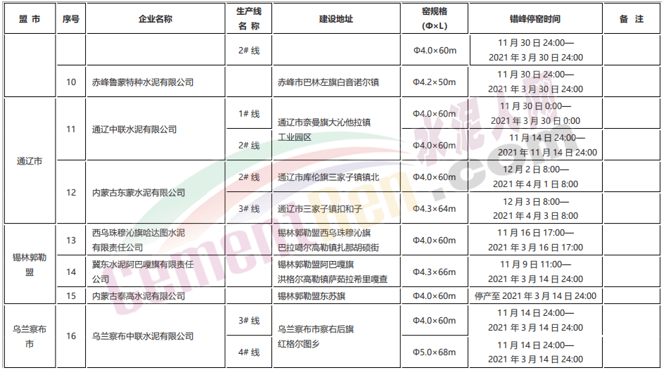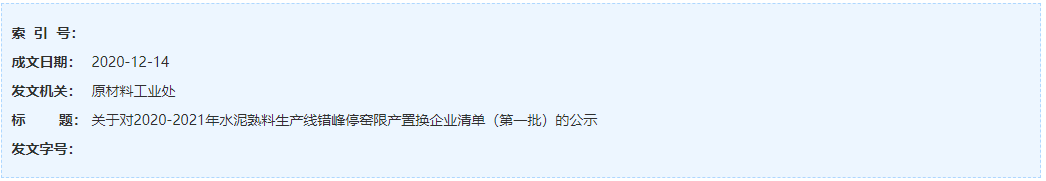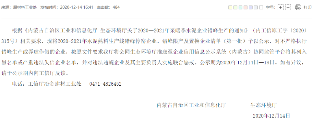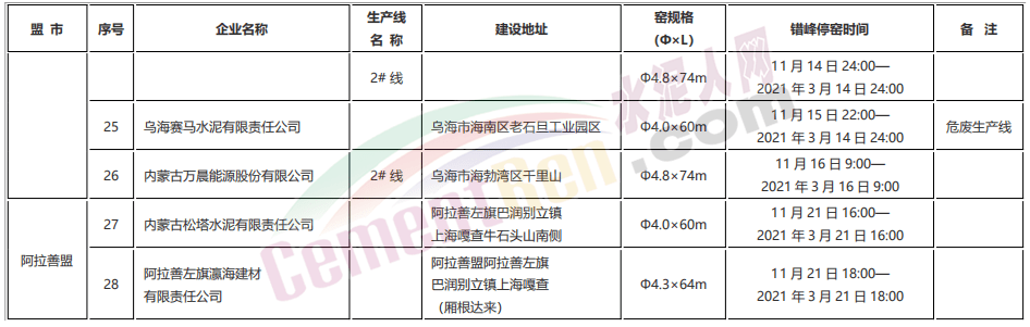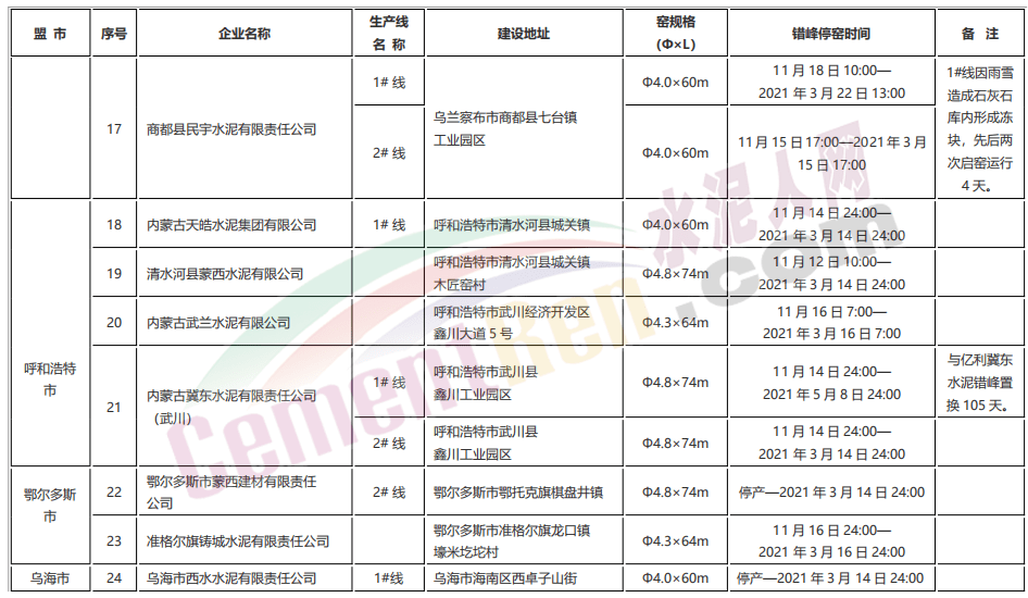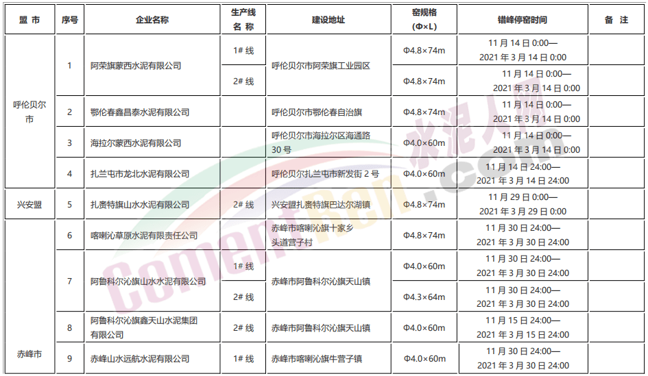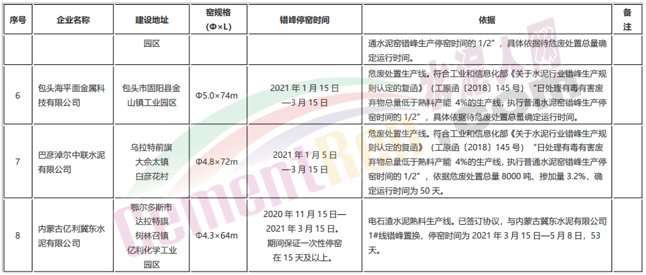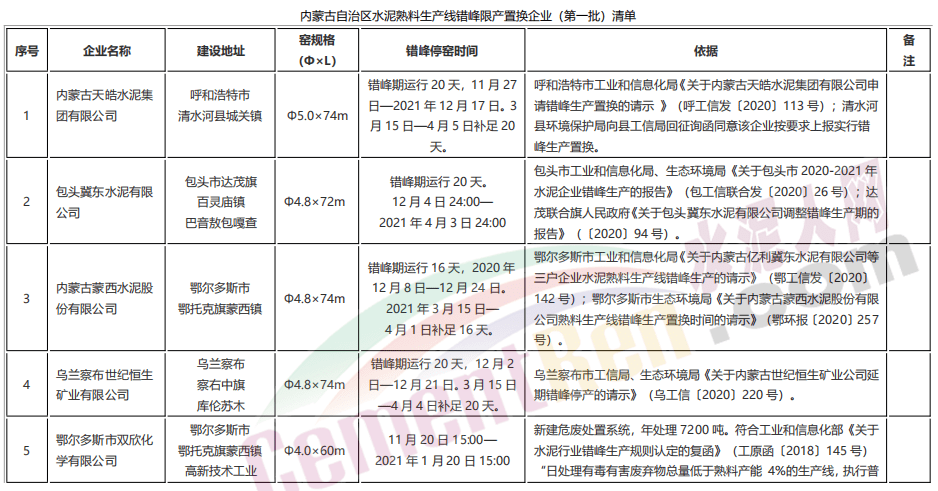 12月14日,內蒙古自治區工信廳公示了2020-2021年水泥熟料生產線錯峰停窯限產置換企業清單(第一批),共有28家水泥企業被納入錯峰生產停窯企業(第一批)清單,另有8家水泥企業被納入錯峰限產置換企業(第一批)清單。原文如下: 內蒙古自治區水泥熟料生產線 錯峰生產停窯企業(第一批)清單