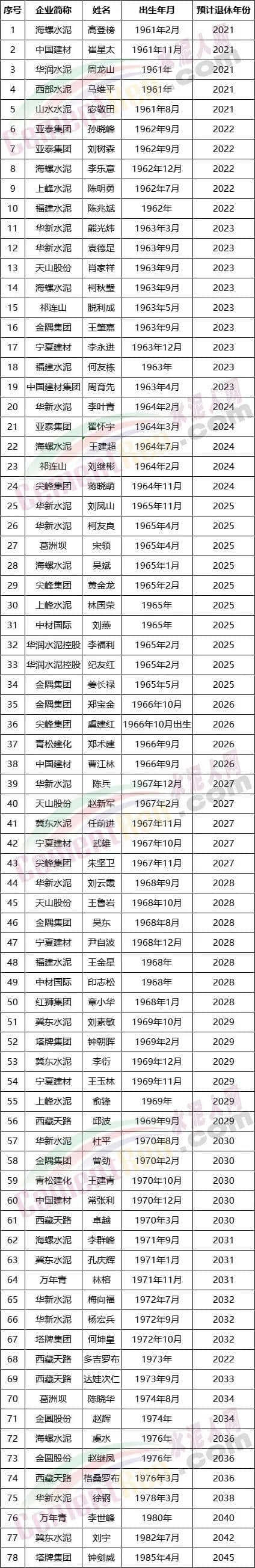 據水泥人網不完全統計78位上市企業高管中有34位將于5年內到退休年齡。其中海螺水泥總工李樂意2022年到退休年齡,祁連山水泥董事長脫利成、華新水泥南部事業部總裁熊光煒、湖北西部事業部總裁袁德足、天山股份肖家祥、海螺水泥柯秋璧2023年到退休年齡, 華新水泥總裁李葉青、尖峰集團董事長蔣曉萌、海螺水泥副董事長王建超、亞泰集團翟懷宇、祁連山水泥總裁劉繼彬2024年到退休年齡... ...