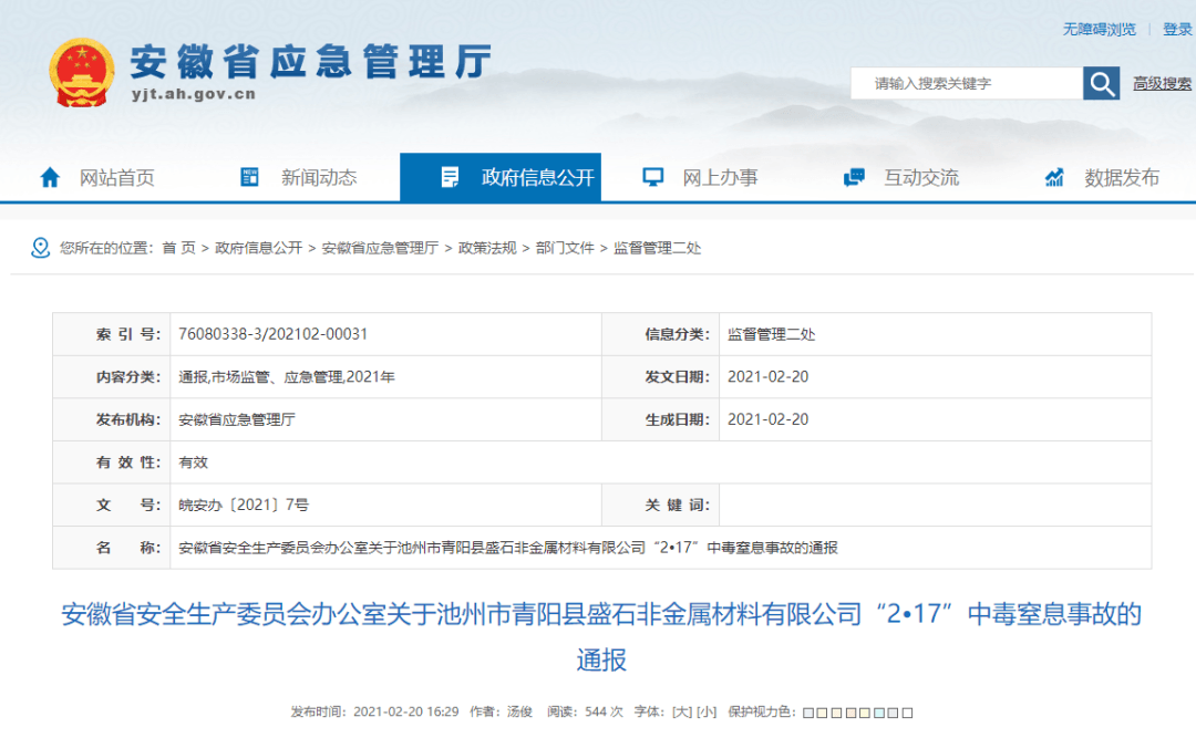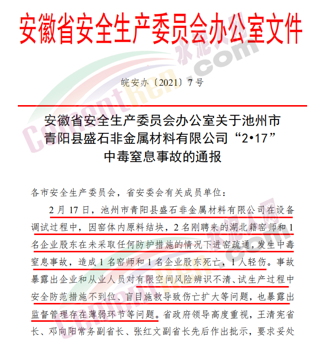 日前,安徽省應(yīng)急管理廳發(fā)布《安徽省安全生產(chǎn)委員會(huì)辦公室關(guān)于池州市青陽(yáng)縣盛石非金屬材料有限公司“2•17”中毒窒息事故的通報(bào)》。
