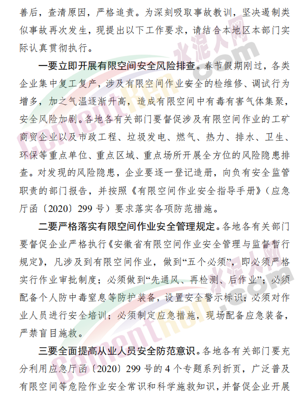 春節(jié)假期剛過(guò),各類企業(yè)集中復(fù)工復(fù)產(chǎn),涉及有限空間作業(yè)安全的檢維修、調(diào)試行為增多,加之氣溫逐漸升高,造成有限空間中有毒有害氣體集聚,安全風(fēng)險(xiǎn)加劇。各地各有關(guān)部門要督促涉及有限空間作業(yè)的工礦商貿(mào)企業(yè)以及市政工程、垃圾發(fā)電、燃?xì)狻崃Α⑴潘⑿l(wèi)生、環(huán)保等重點(diǎn)單位、重點(diǎn)區(qū)域、重點(diǎn)場(chǎng)所開(kāi)展全方位的風(fēng)險(xiǎn)隱患排查。對(duì)發(fā)現(xiàn)的風(fēng)險(xiǎn)隱患,企業(yè)要逐一登記造冊(cè),向負(fù)有安全監(jiān)管職責(zé)的部門報(bào)告,并按照《有限空間作業(yè)安全指導(dǎo)手冊(cè)》(應(yīng)急廳函〔2020〕299號(hào))要求落實(shí)各項(xiàng)防范措施。