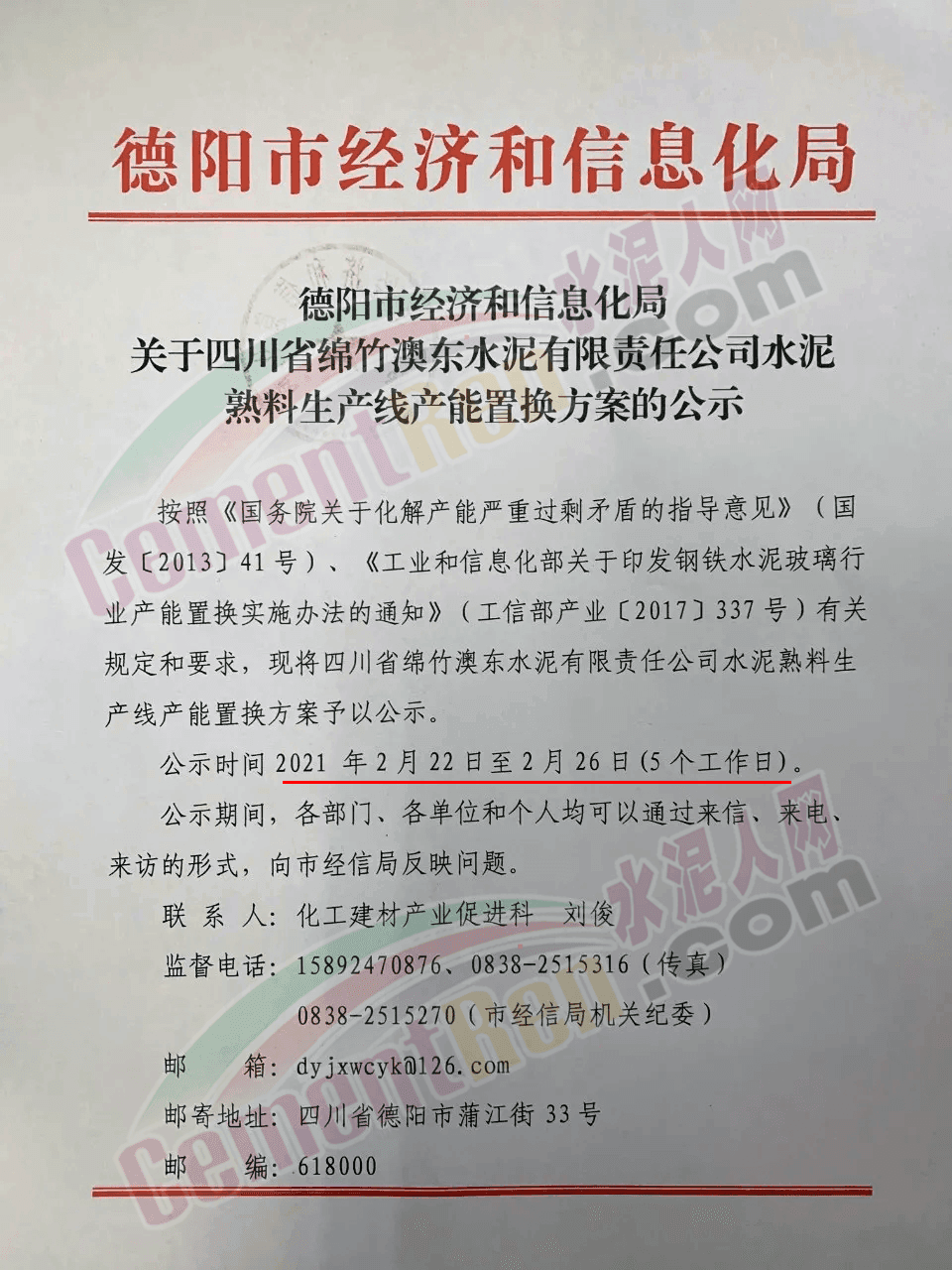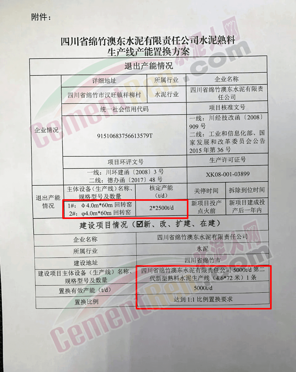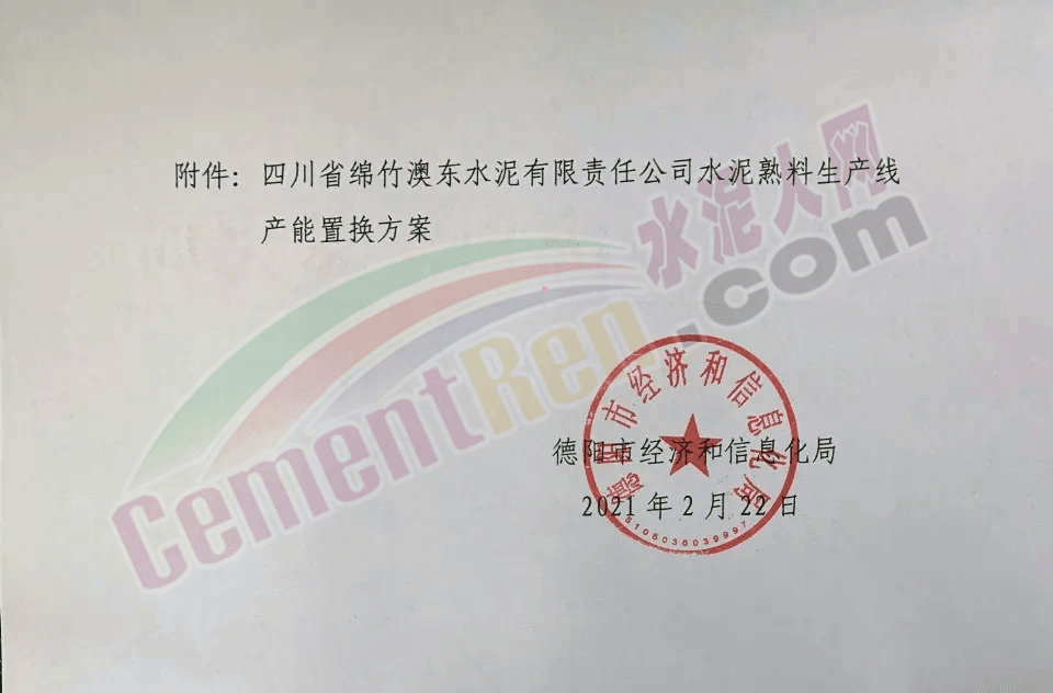 日前,四川省德陽經濟和信息化局發布《關于四川省綿竹澳東水泥有限責任公司水泥熟料生產線產能置換方案的公示》。公示內容為四川省綿竹澳東水泥有限責任公司退出兩條2500t/d熟料生產線于用在區域內新建一條5000t/d熟料生產線,置換比例為1:1。