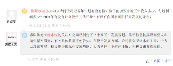 日前,有投資者在上市企業平臺向海螺水泥(600585)提問關于近五年計劃,以及今年的投資規劃。