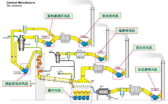 在水泥生產線中,風機是水泥廠的第二大功率消耗設備群, 一條中等規模的水泥生產線,僅大型風機就有7-10臺,小型風機百余臺。
