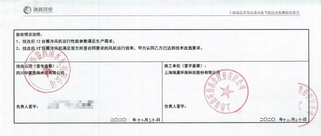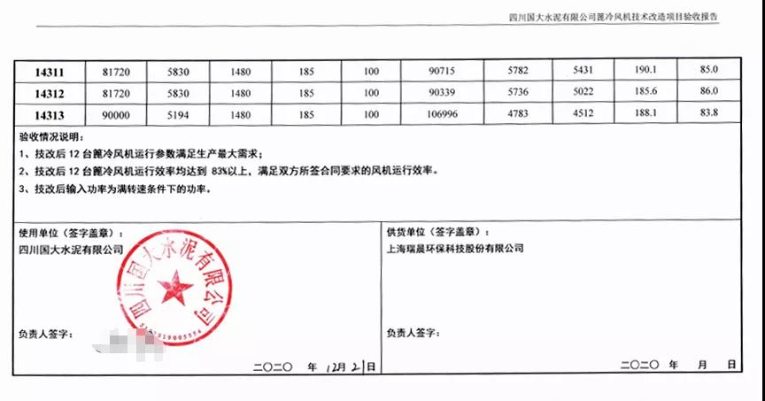 瑞晨環保高效篦冷風機配合凱盛院配套IKN第四代篦冷床的升級換代項目完美驗收,得到凱盛院與四川國大水泥有限公司各層領導以及西南水泥高層的高度認可與一致好評。