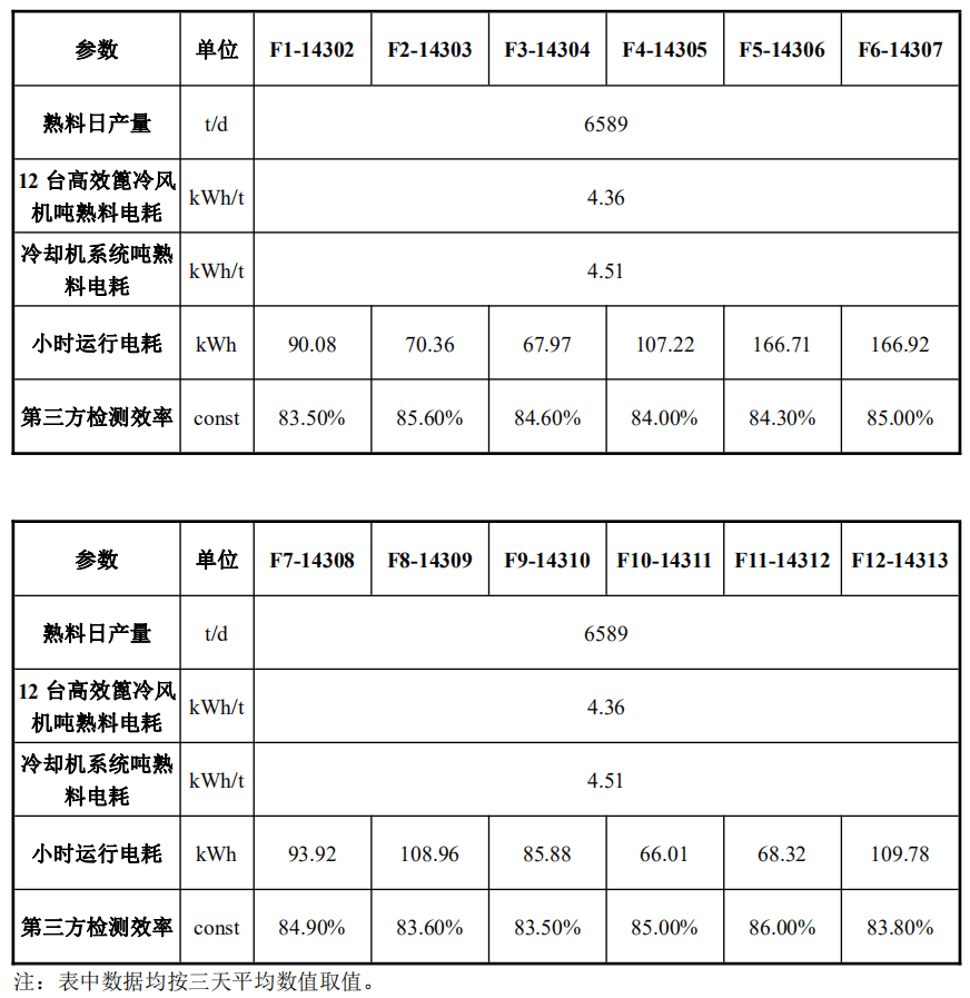 經瑞晨環保改造后,四川國大12臺高效篦冷風機F1-14302~F12-14313運行穩定,經過第三方(綿陽旗諾)標定,運行效率分別高達83.50%、85.60%、84.60%、84.00%、84.30%、85.00%、84.90%、83.60%、83.50%、85.00%、86.00%、83.80%。熟料提產至6589t/d后,12臺高效篦冷風機噸熟料電耗降低至4.36kWh/t,篦冷機系統熟料電耗降低至4.51kWh/t滿足技術合同約定的噸熟料電耗≤4.93kWh/t。